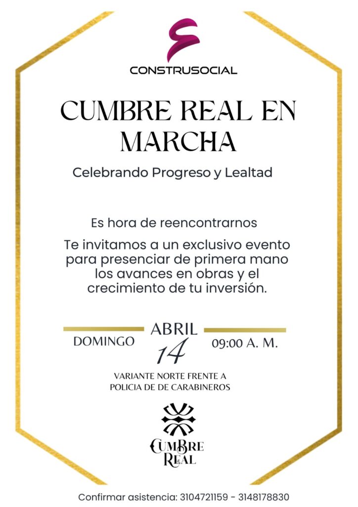 Este Domingo 14 de Abril desde las 9:00 de la mañana realizaremos un gran evento con el objetivo de conocer los avances de obra en el proyecto Cumbre Real.